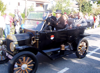 Insbesondere der wunderbare Oldtimer – stark besetzt mit dem Personen des Vorstand – machte großen Eindruck auf die vielen Zuschauer am Straßenrand, er war ein beliebtes Motiv für die unendlich vielen Fotografen, auch weil die Kostüme, der Schnauzer und Mittelscheitel so gut zum Ambiente paßten.